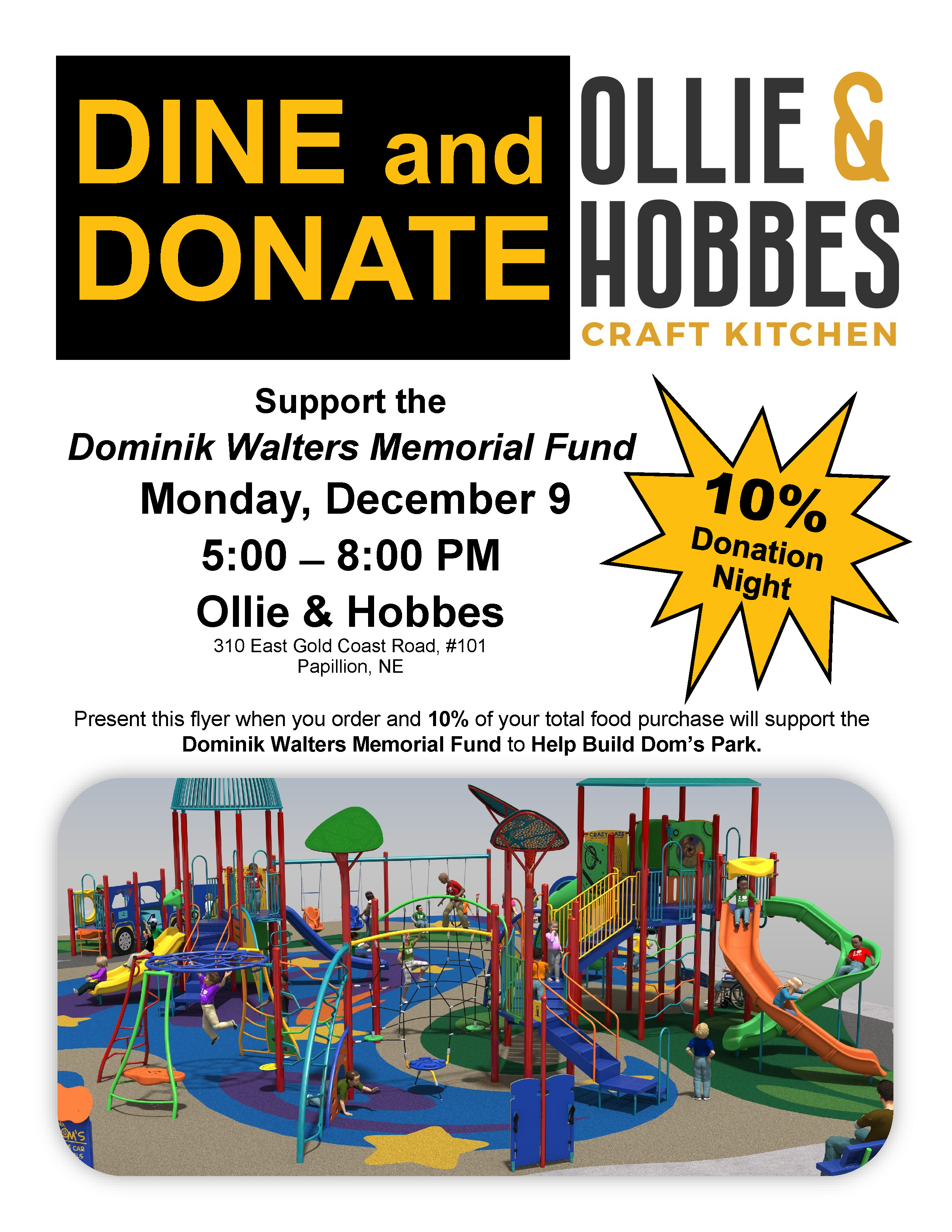 Come have a delicious dinner with us and help us build Dom’s Park! On Monday, December 9th from 5-8pm, Ollie & Hobbes in Papillion has graciously agreed to donate 10% of sales to Dom’s Memorial Fund. Amazing! All you have to do is DOWNLOAD and PRINT the flyer shown on the right (below on mobile) and present it to your server. Click the Download button below to download a PDF of the flyer.