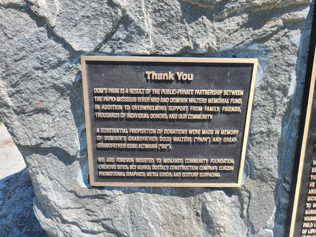 We are indebted to Luke Altmann, Jake Meyer, Steve Atkins for making the boulder donation possible, Russ Fittje for highlighting the artistic callouts to get Dom’s likeness correct, Bodie Dostal and crew for installing the plaques, the Papio NRD for continue to let us recognize Dom, as well as every single person who donated to our cause. All of you were instrumental in making this possible and allowing playground visitors to learn a bit about Dom and why Dom’s Park exists. A thank you will never be enough!!