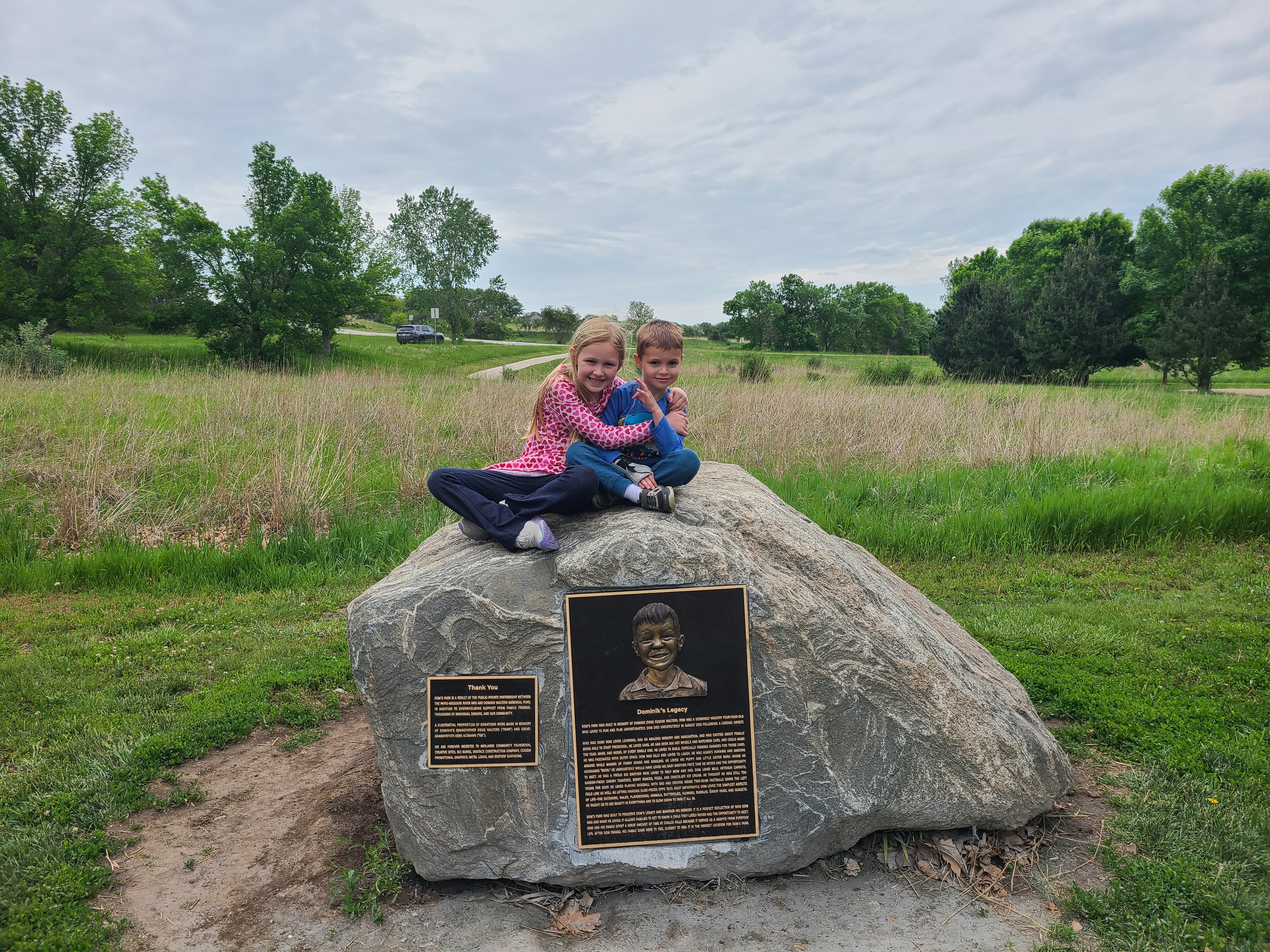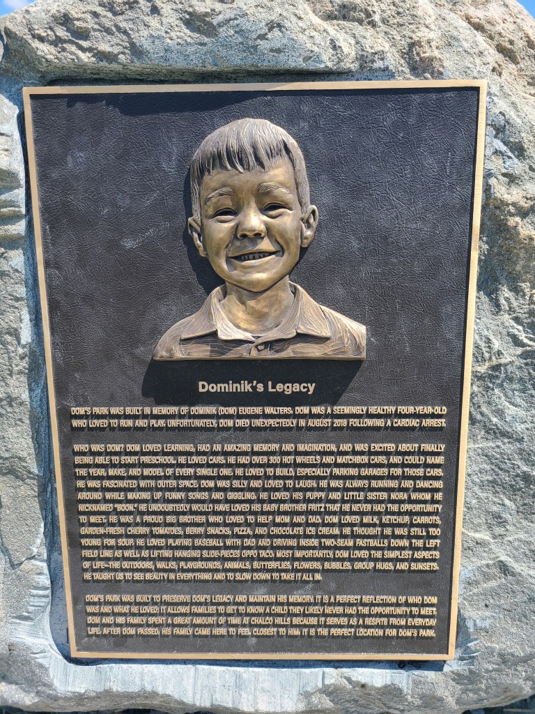The boulder on which the plaques are installed is from Minnesota and was graciously donated. When we visit Dom’s Park, it is amazing to watch kids climb and play on that boulder. We have no way of knowing how many parents and visitors took some time to do a quick internet search about why Dom’s Park exists, but the plaques put all the meaningful information right there for them—no extra steps needed. It means so much to us to see parents and visitors take a moment read the plaques.